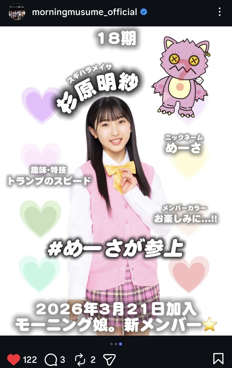 【公式】モーニング娘。’26新メンバー杉原明紗ちゃんのニックネームが決定!