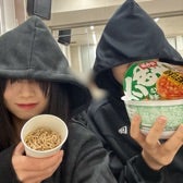 井上はるさんが年越しそば食べようと持参してきた緑のたぬきを弓桁あここんと分け合う