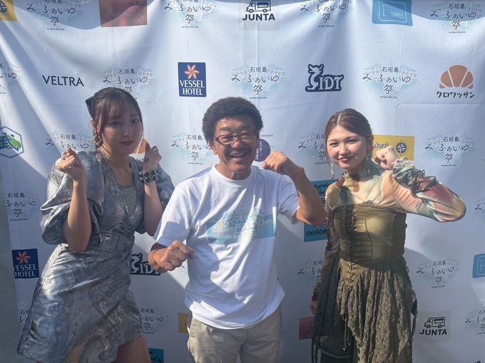 譜久村聖と竹内朱莉と具志堅用高のスリーショット!!